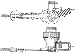 Прекрасная двуручная пила. В случае отсутствия запасов сжатого воздуха, её можно использовать как традиционную двуручную пилу, наверное можно. На рисунке, указано место, где Фуллертон предложил разместить "маленькие двигатель или машину на сжатом воздухе" ("small engine or compressed air machine"), но нигде не указал, откуда в лесу возьмётся сжатый воздух. Скорее всего, это специфика патента (чем меньше конкретики, тем шире применение патента), потому как конструкцию цепи и механику пилы автор расписал достаточно подробно.